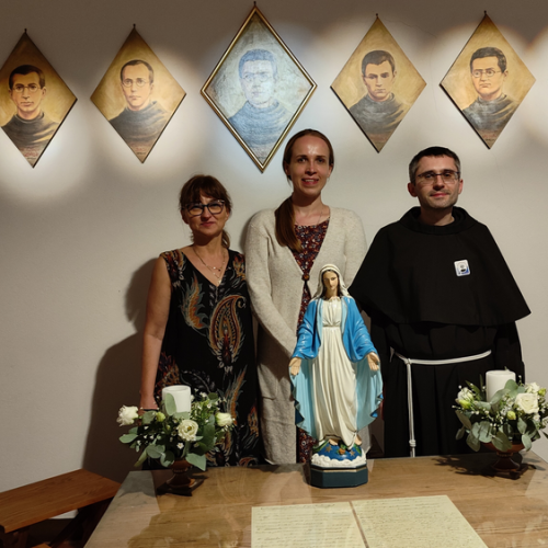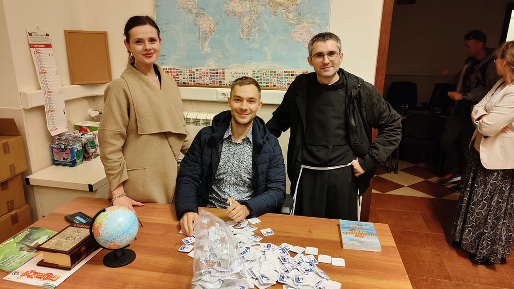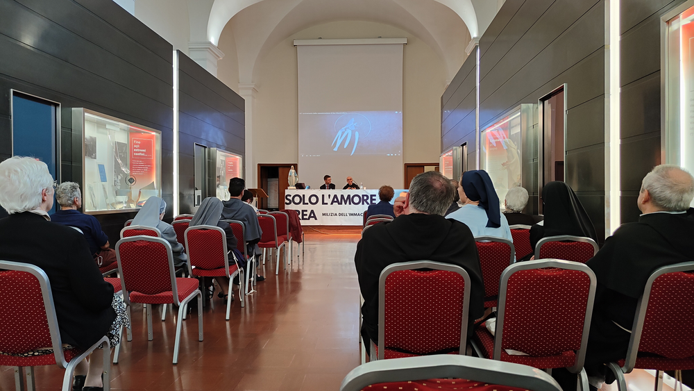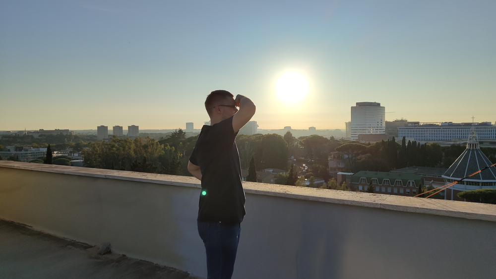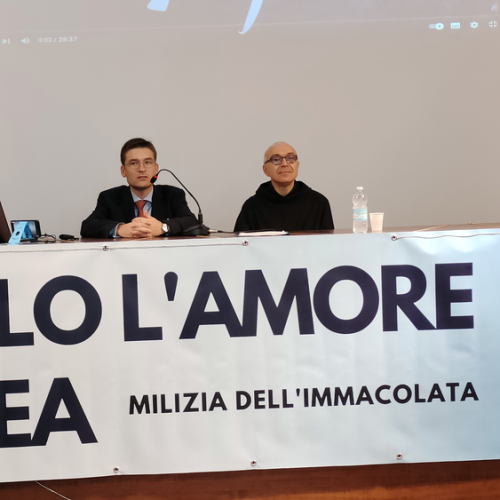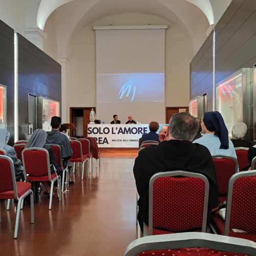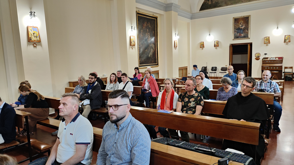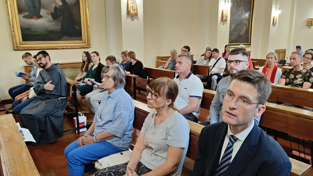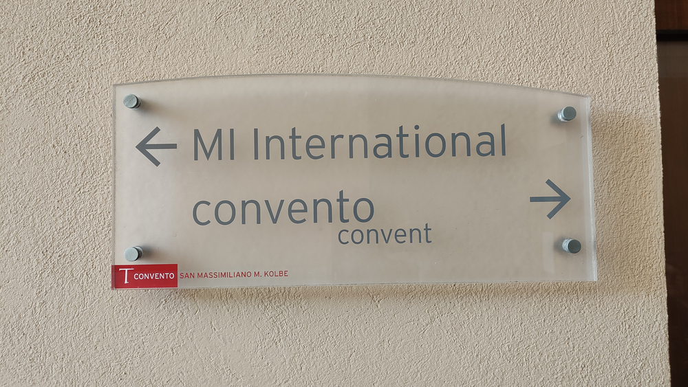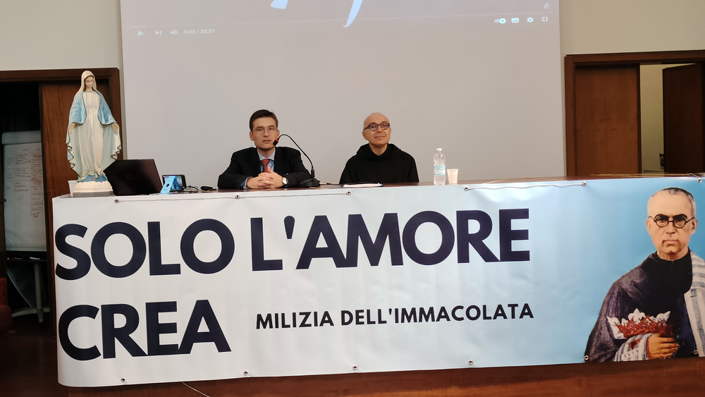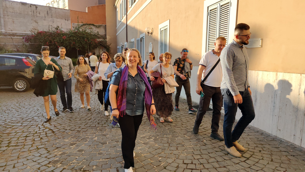 Następnie w sali konferencyjnej młodzi rycerze Niepokalanej ze słonecznej Italii przedstawili wyjątkowy spektakl - walkę duchową dobra ze złem, przedstawione zostały zwycięskie zmagania św. Maksymiliana z podszeptami szatana. Jakże aktualne we współczesnym świecie! Na każdego uczestnika czekało światełko Pokoju, które zabraliśmy do swoich domów. Wyciszenie i pokój serca mogliśmy odnaleźć ponownie w Kaplicy na Adoracji Najświętszego Sakramentu - niezwykłej, bo w sposób szczególny poprzez m.in. wylosowany cytat z pism św. Maksymiliana dotknęła każdego z nas. Zwieńczeniem pierwszego dnia pobytu w Rzymie była wspólna agapa na dachu Casa Kolbe, gdzie oprócz wspaniałej włoskiej pizzy mogliśmy porozmawiać z innymi uczestnikami nie tylko z Włoch, ale także z Hiszpanii i Brazylii.