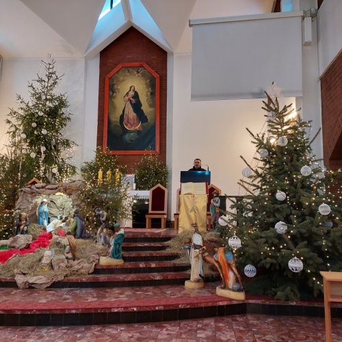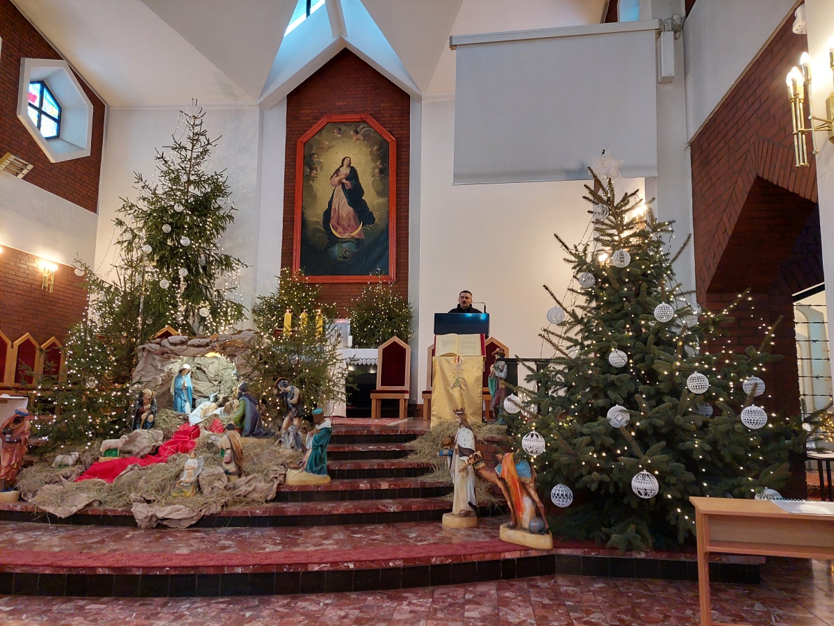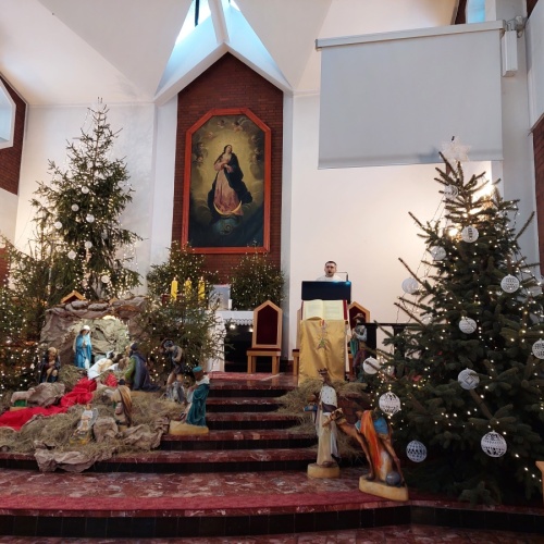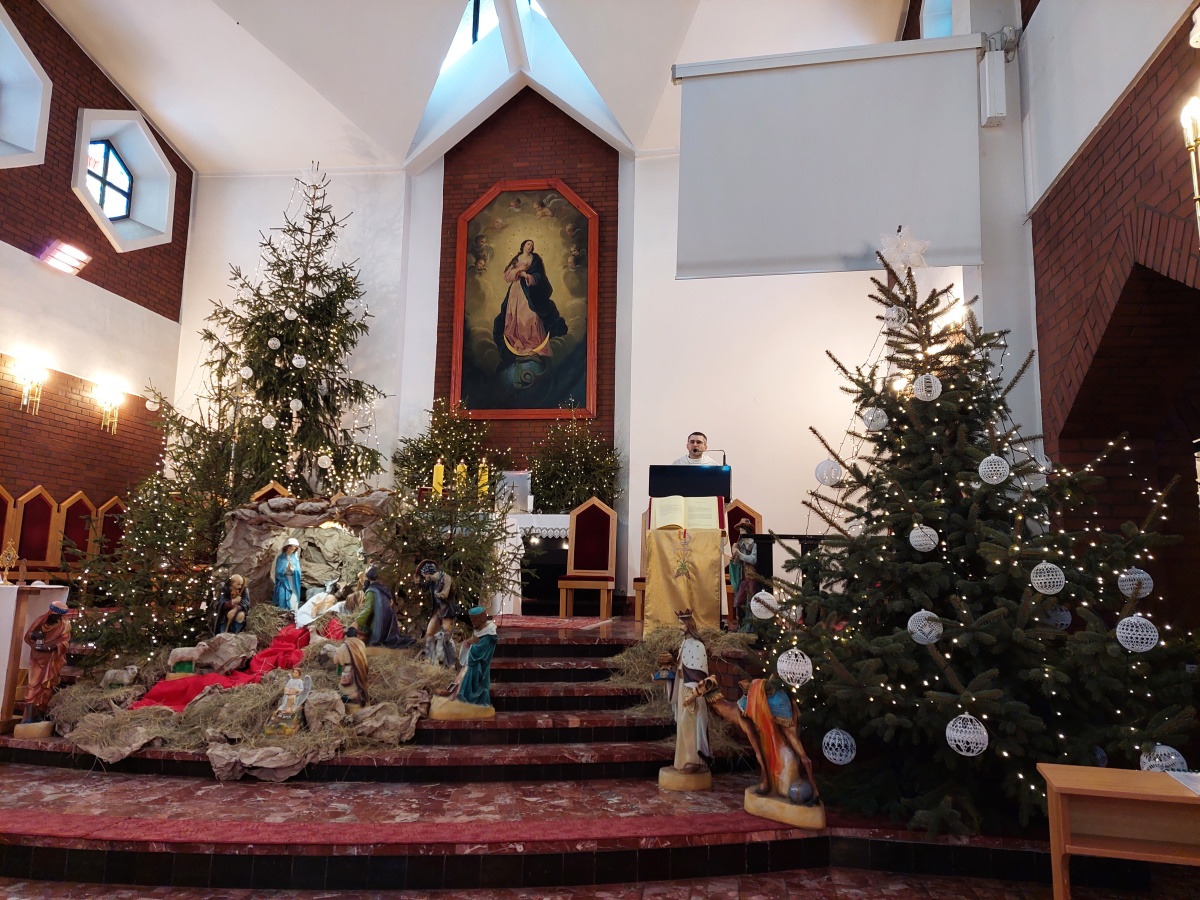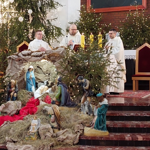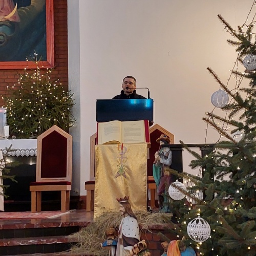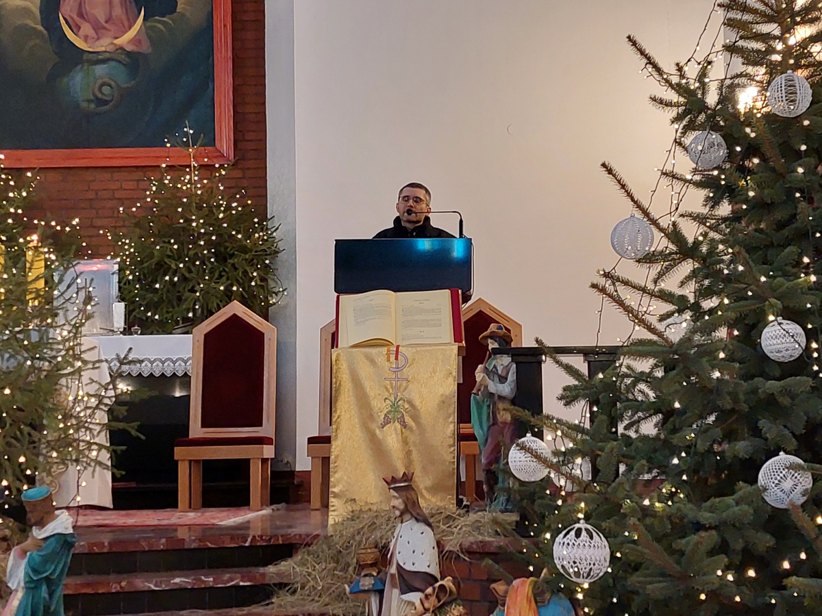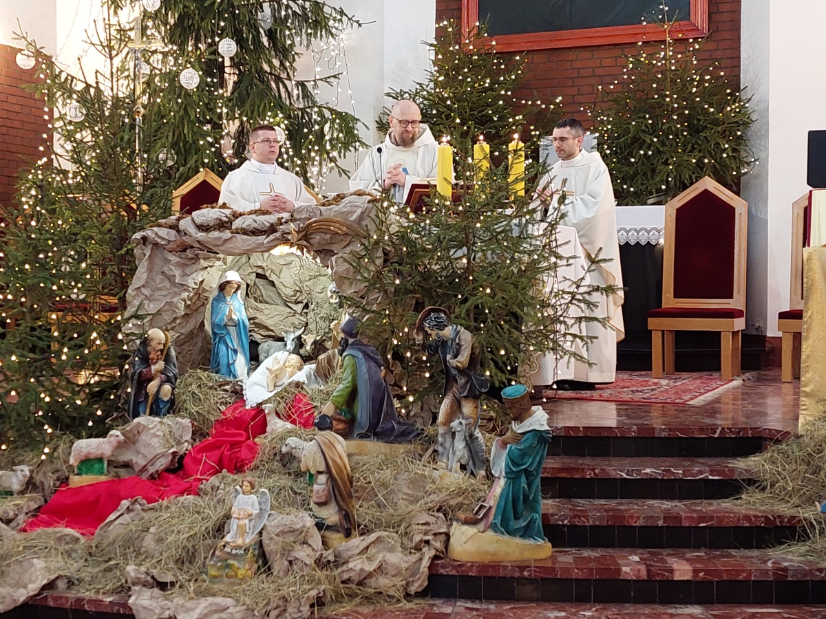 Pomimo wielu trudności, w tym obfitych opadów śniegu dotarliśmy nieco spóźnieni ale bardzo licznie na wspólne kolędowanie do Harmęż. Spotkanie rozpoczęło się od Mszy świętej, której przewodniczył o. Tomasz Pawlik OFMConv z Rychwałdu, współkoncelebrowli - o. Arkadiusz Bąk OFMConv oraz ks. Grzegorz Guga, asystent MI w Żywcu. W swojej homilii o. Arkadiusz Bąk mówił o roli Matki Bożej w historii Polski i świata, wiele trudnych do zrozumienia zwycięstw możemy jedynie wytłumaczyć Bożą interwencją. Odpowiedź znajdujemy w Księdze Machabejskiej: „Juda odparł: «Bez trudu wielu może być pokonanych rękami małej liczby, bo Niebu nie czyni różnicy, czy ocali przy pomocy wielkiej czy małej liczby. Zwycięstwo bowiem w bitwie nie zależy od liczby wojska; prawdziwą siłą jest ta, która pochodzi z Nieba” (1 Mch 3, 8).