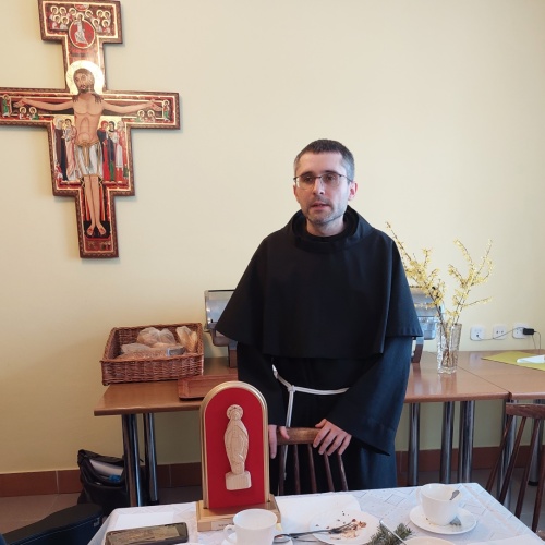 Maryja była rónież bardzo ważna w życiu więźniów w Auschwitz. Maryja nigdy nie przestaje działać, nie porzuca swoich dzieci szczególnie w chwili cierpienia. O. Arkadiusz przybliżył zebranym niezwykłą historię małej, niespełna 30-to centymetrowej figurki Matki Bożej - dziś nazywanej Matką Bożą zza drutów, która znajduje się w bocznym ołtarzu w kościele w Harmężach, a którą wyrzeźbił - Bolesław Kupiec z Poronina, więzień Auschwitz o nr 792.