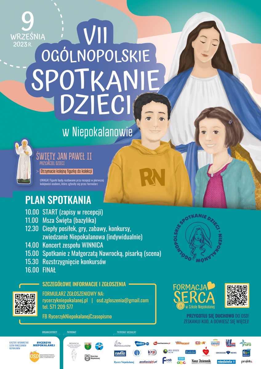 Serdecznie zapraszamy wszystkie dzieci wraz z rodzinami i opiekunami na VII Ogólnopolskie Spotkanie Dzieci w Niepokalanowie, które odbędzie się 9 września 2023 r. W tym roku OSD będzie przeżywane pod hasłem „Święty Jan Paweł II przyjaciel dzieci”.