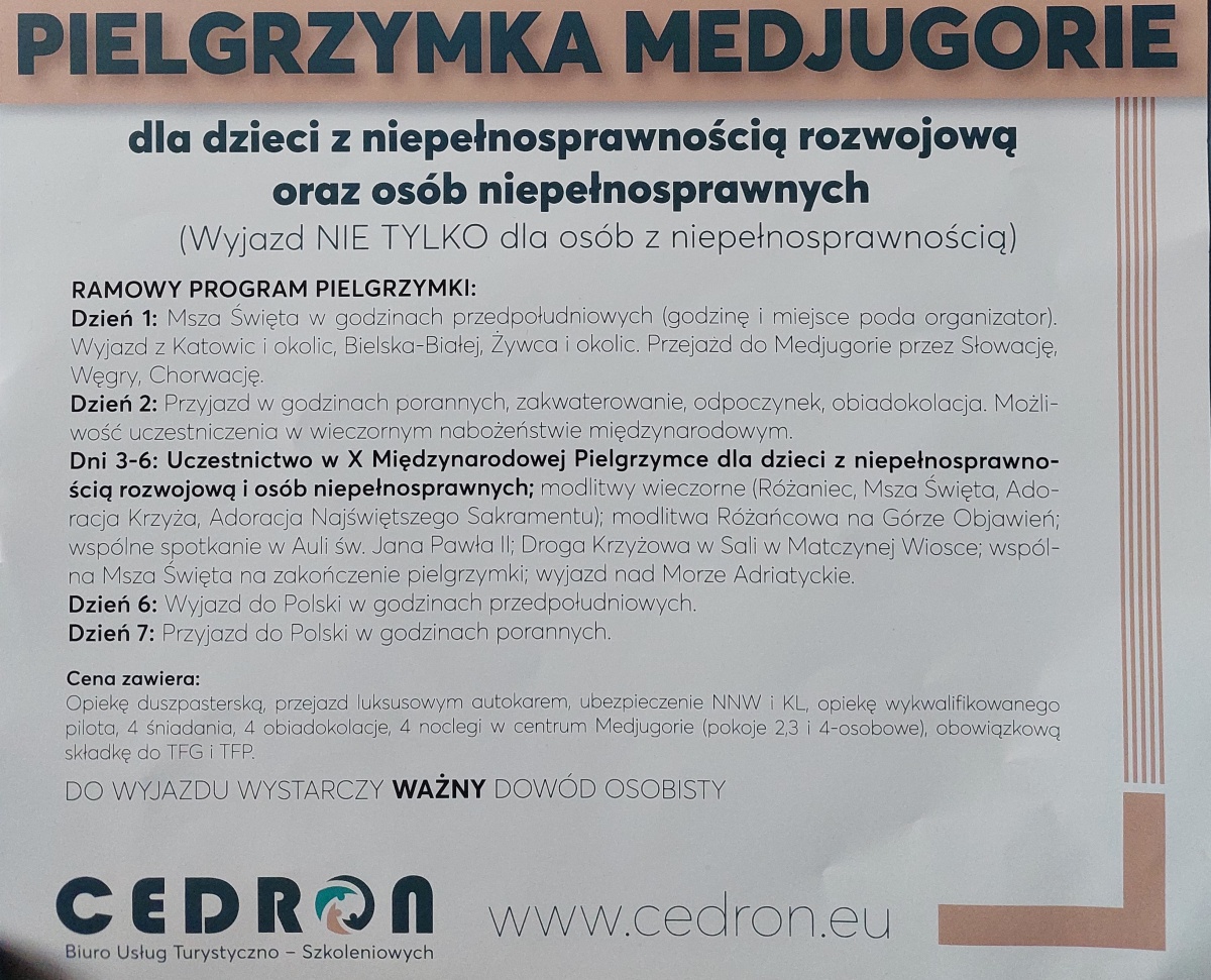powrót do listy Pielgrzymka dla osób z niepełnosprawnościami 17 lutego 2024 Biuro CEDRON zaprasza na niecodzienną pielgrzymkę do MEDJUGORIE.