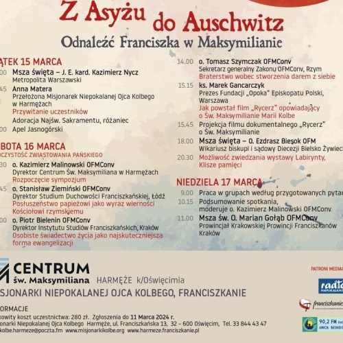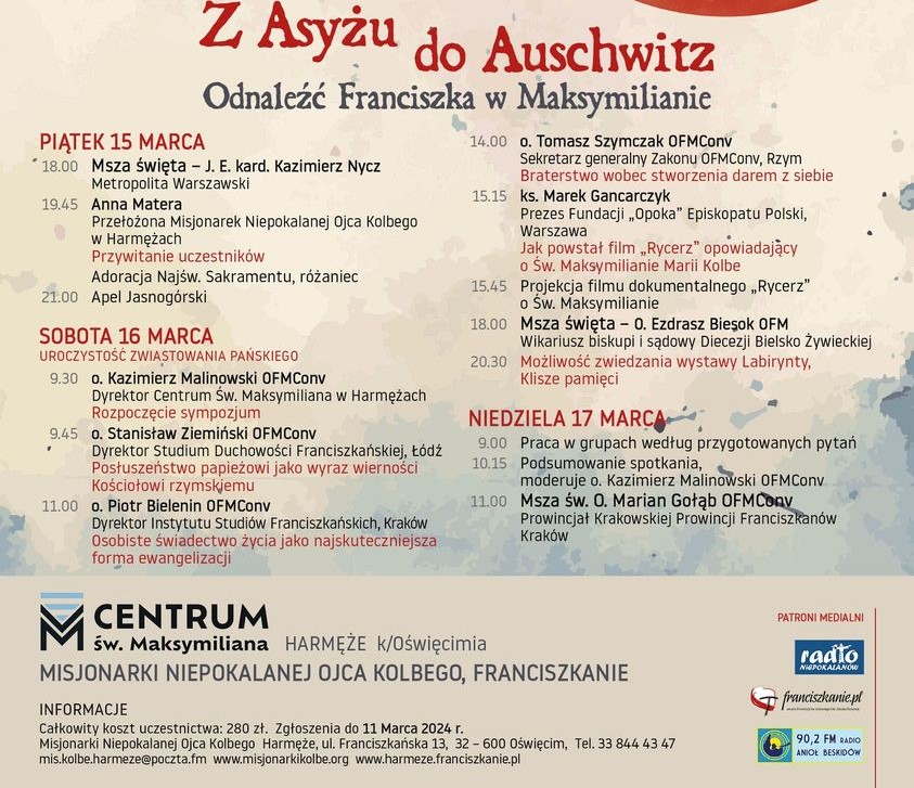 Misjonarki o. Kolbego oraz Franciszkanie z Harmęż zapraszają na XXII Dni Kolbiańskie w dniach 15 - 17 marca 2024 r. Zapisy do 11 marca. Koszt 280 zł. Szczegóły na plakacie.