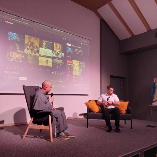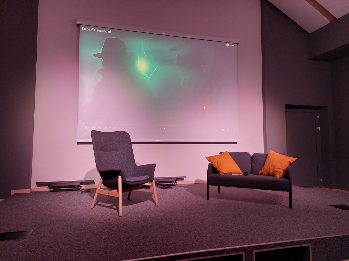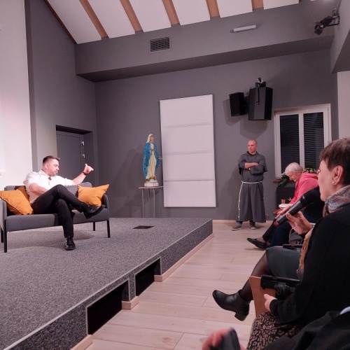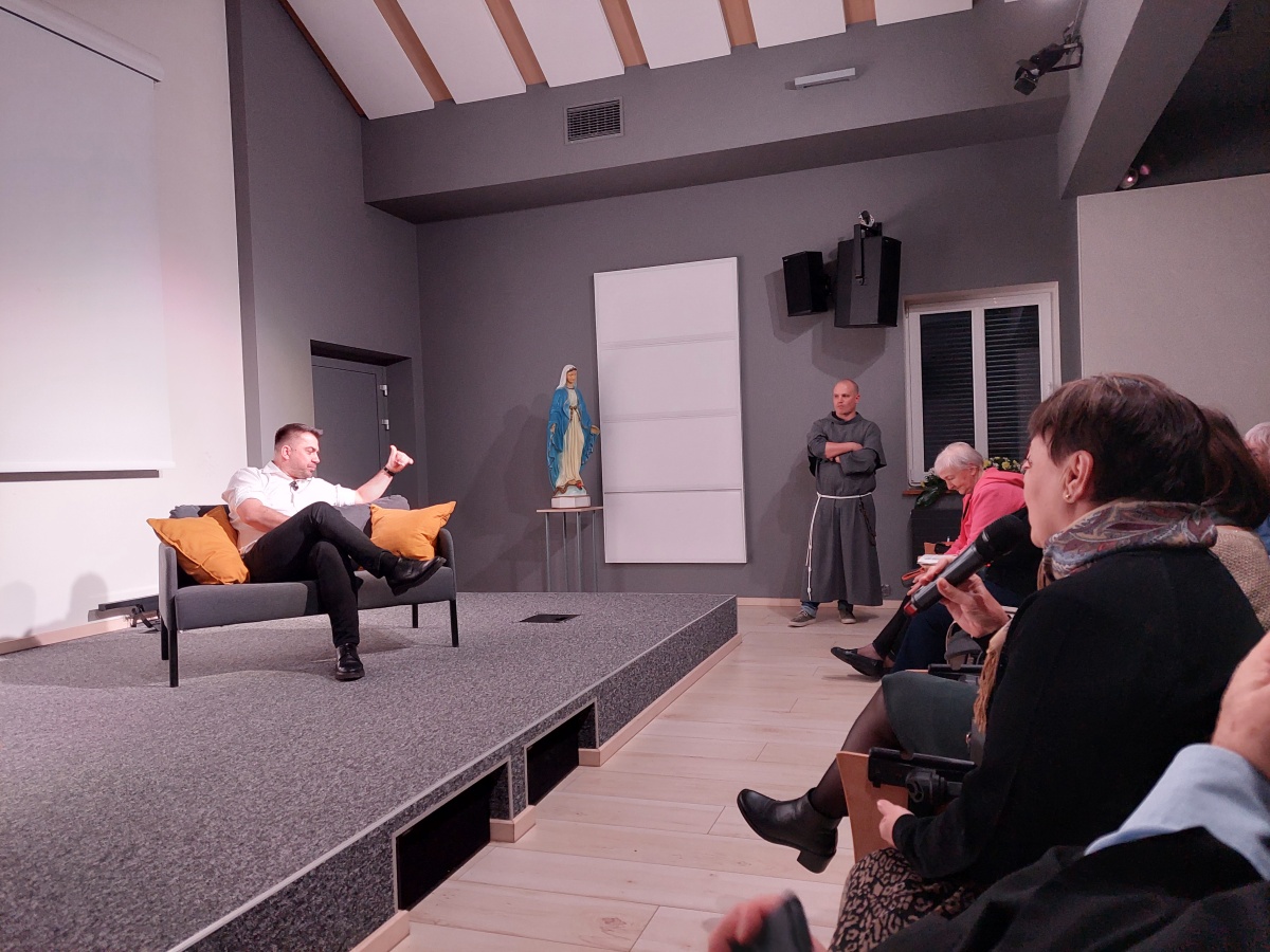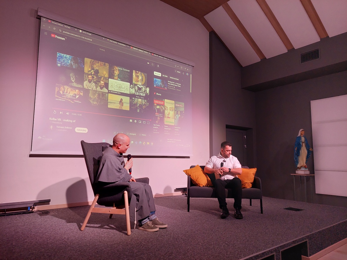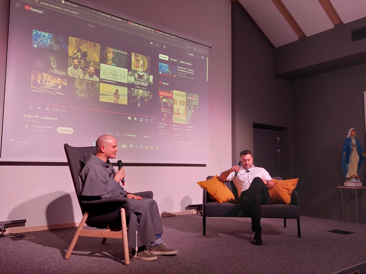Po południu z wykładem pt: "Od oddania się Maryi i powołania Rycerstwa Niepokalanej do oddania życia za brata - droga nadziei św. Maksymiliana" przybył do nas o. Piotr Bielenin. Po południu wszyscy mieli niepowtarzalną okazję obejrzenia filmu w technologii VR o św. Maksymilianie, a potem uczestnicy podczas spotkania z twórcami na żywo mogli zadawać pytania reżyserowi filmu.