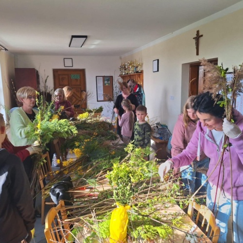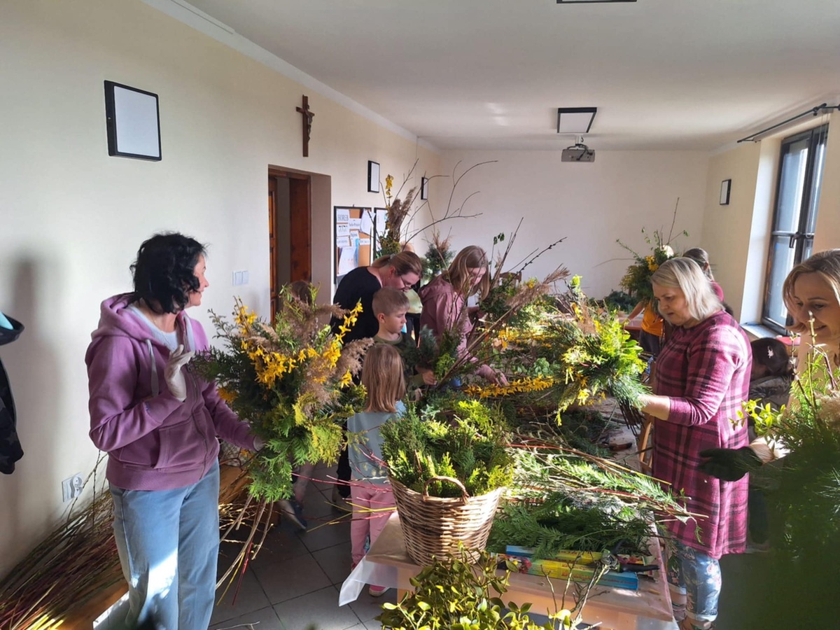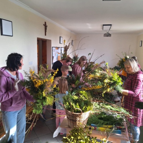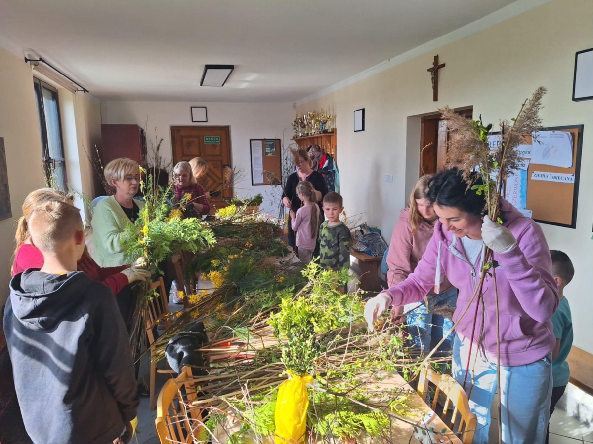 Warsztaty, które odbyły się 10 kwietnia 2025 roku, zgromadziły dzieci wraz z rodzicami, którzy przybyli z własnoręcznie zebranymi roślinami. Spotkanie miało na celu nie tylko wspólne przygotowanie palm, ale również przekazanie uczestnikom bogatej symboliki związanej z tradycją wykonywania palm wielkanocnych. Uczestnicy mieli okazję poznać również techniki tworzenia trzonu palmy, sposoby jej wzmacniania oraz wykonywania owijek, które stanowią odniesienie do skrępowania rąk Jezusa i Jego pięciu ran. Efektem wspólnej pracy były piękne, kolorowe palmy, które wzięły udział w III Konkursie na tradycyjnie przygotowaną palmę starowiejską.