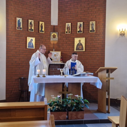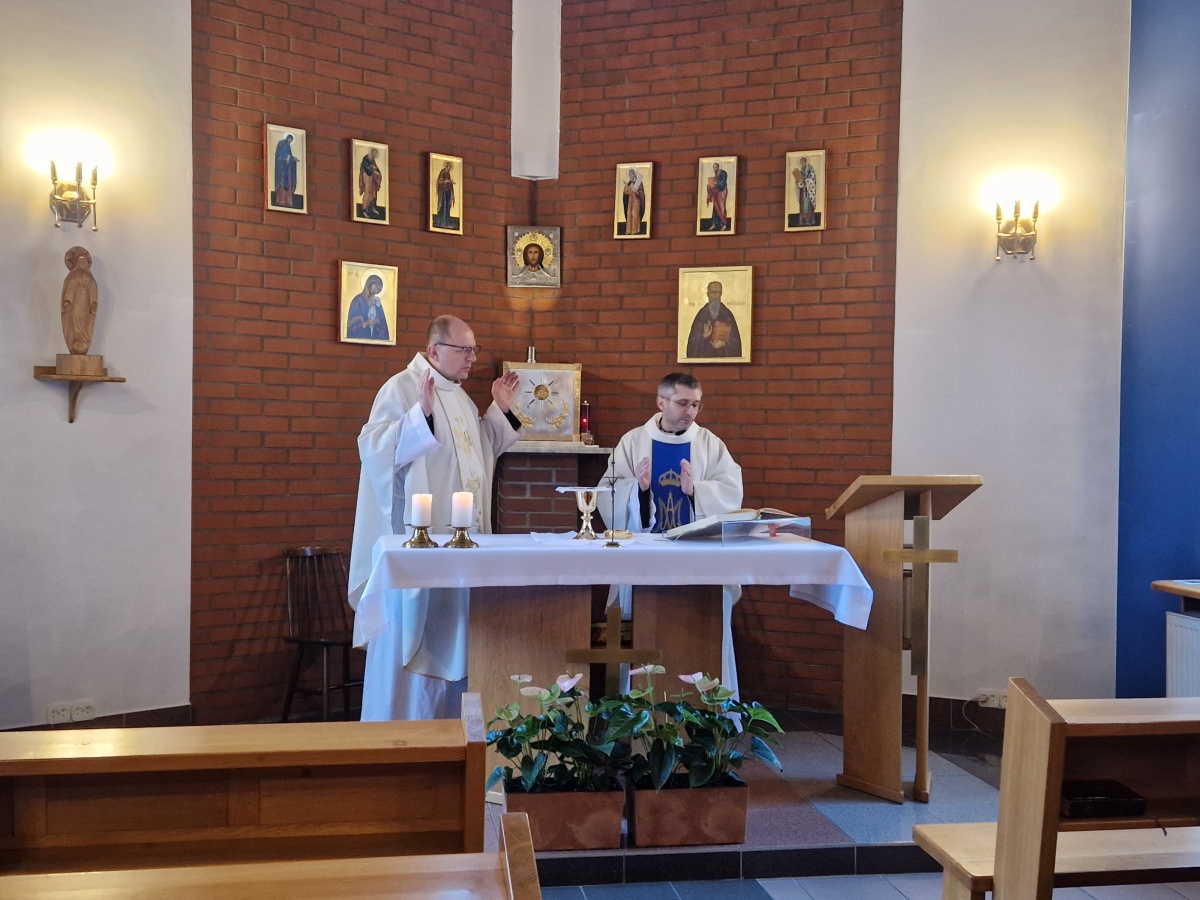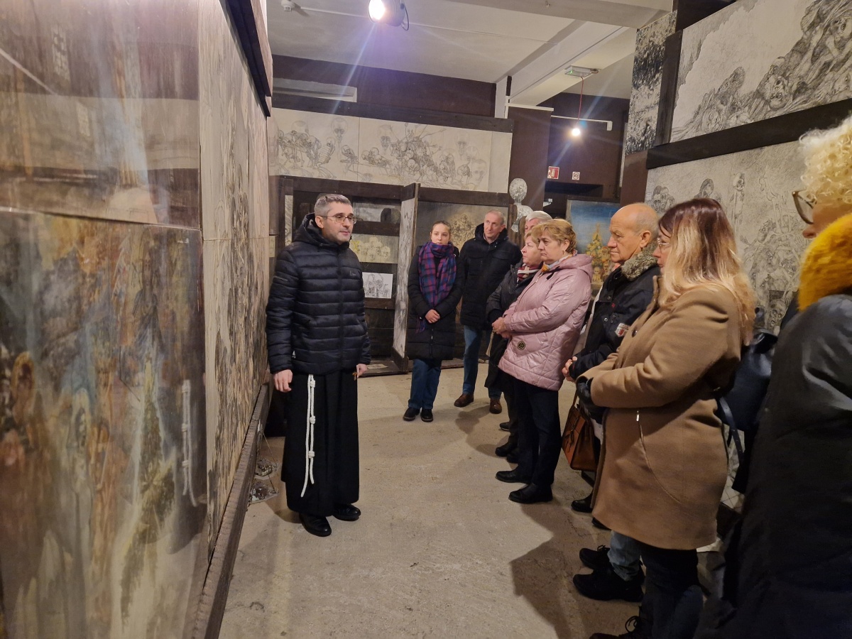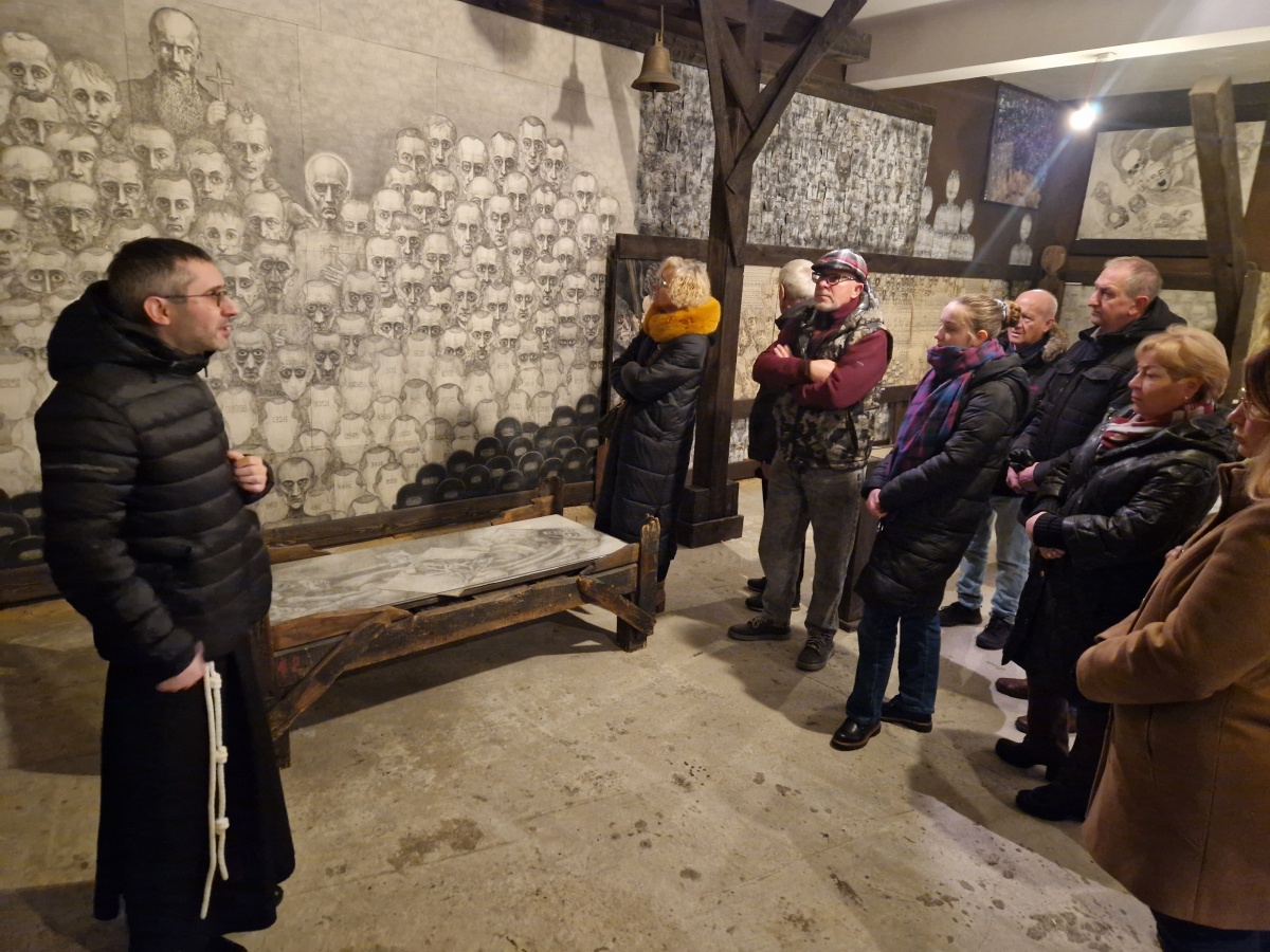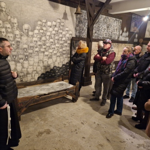 Pielgrzymi rozpoczęli wydarzenie Mszą Świętą w ich intencji, celebrowaną przez o. Arkadiusza Bąka i koncelebrowaną przez ks. Szymona Tracza. Następnie zwiedzili przejmującą wystawę „Klisze pamięci” Mariana Kołodzieja, która ukazuje dramatyczne doświadczenia więźnia KL Auschwitz.